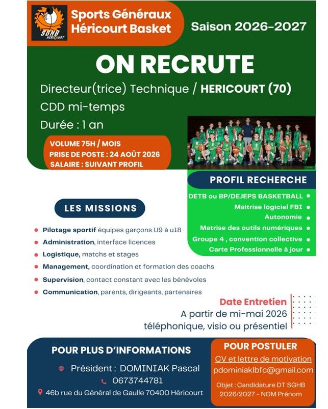 Candidature : CV + lettre de motivation / pdominiaklbfc@gmail.com / Objet : Candidature DT SGHB 2026/2027 – Nom Prénom